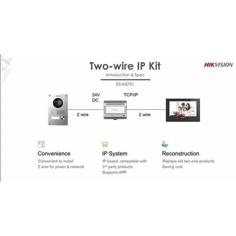 Le kit d&rsquoentrée de porte vidéo unifamiliale Hikvision à 2 fils convient aux maisons et aux petits bureaux. L’interphone Hikvision peut être facilement installé et configuré. Le câblage à 2 fils existant peut être utilisé. Ce kit d’interphone convient parfaitement au remplacement de systèmes existants. Un « ouvre-porte » peut être connecté à la station externe, qui est également alimentée en tension. Nous vous recommandons de visualiser le diagramme entre les images qui rendent graphiquement le fonctionnement de ce type de solution pour le système de portier vidéo intégré.